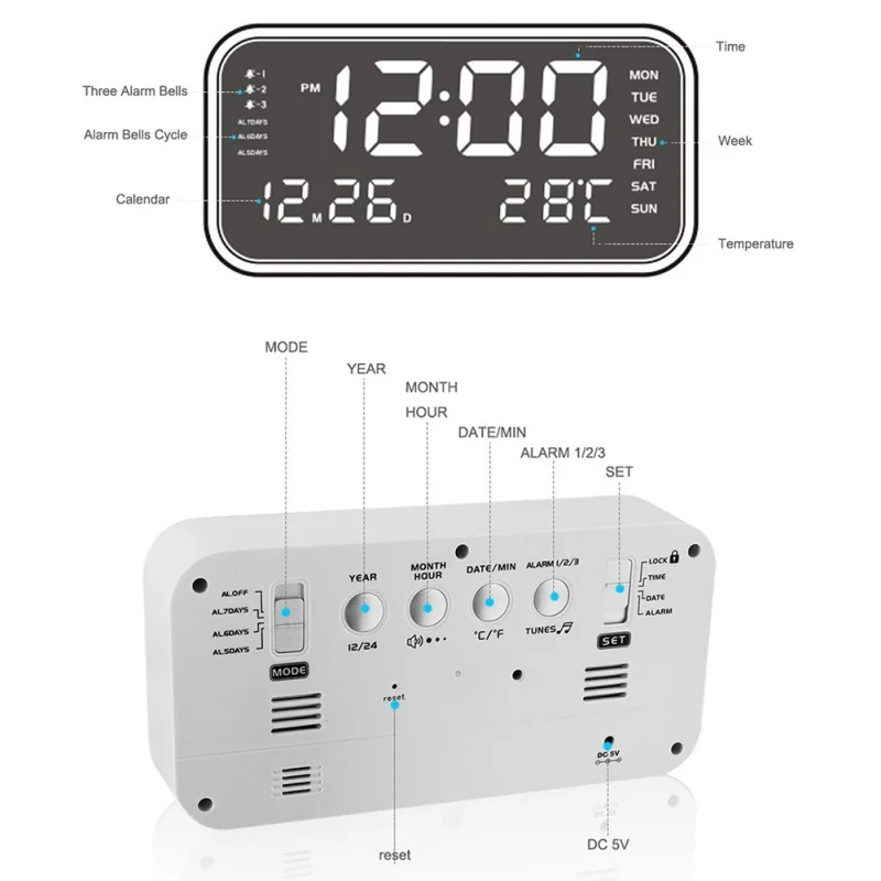 LED Digital Electronic Nixie Clock USB charge Large Number Display Alarm Clock Mirror Watch Tempera